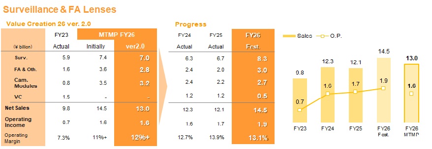 - ⇒Target to increase sales composition ratio of “Surveillance & FA lenses", and